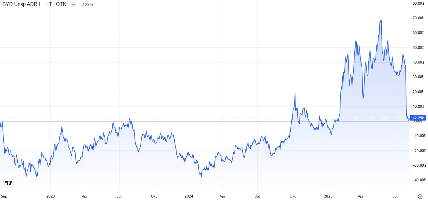 Insgesamt setzt BYD seinen Wachstumskurs in Europa aber fort und konnte sowohl in Grossbritannien als auch in Deutschland die Verkaufszahlen im Juli im Vergleich zum Vorjahr vervielfachen. In Deutschland lag der Hersteller bereits im April erstmals vor Tesla. Während BYD Marktanteile gewinnt, verliert Tesla in den genannten Regionen an Boden. Teslas Marktanteil in Europa schrumpft inzwischen seit sechs Monaten in Folge, was BYD zusätzlichen Rückenwind verschafft.