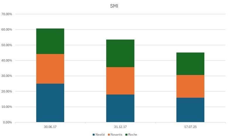 Die Dominanz von Nestlé, Novartis und Roche im SMI und SPI ist in den letzten Jahren deutlich zurückgegangen. Was sind die Ursachen für diesen Rückgang – und welche Auswirkungen hat er auf Anleger?