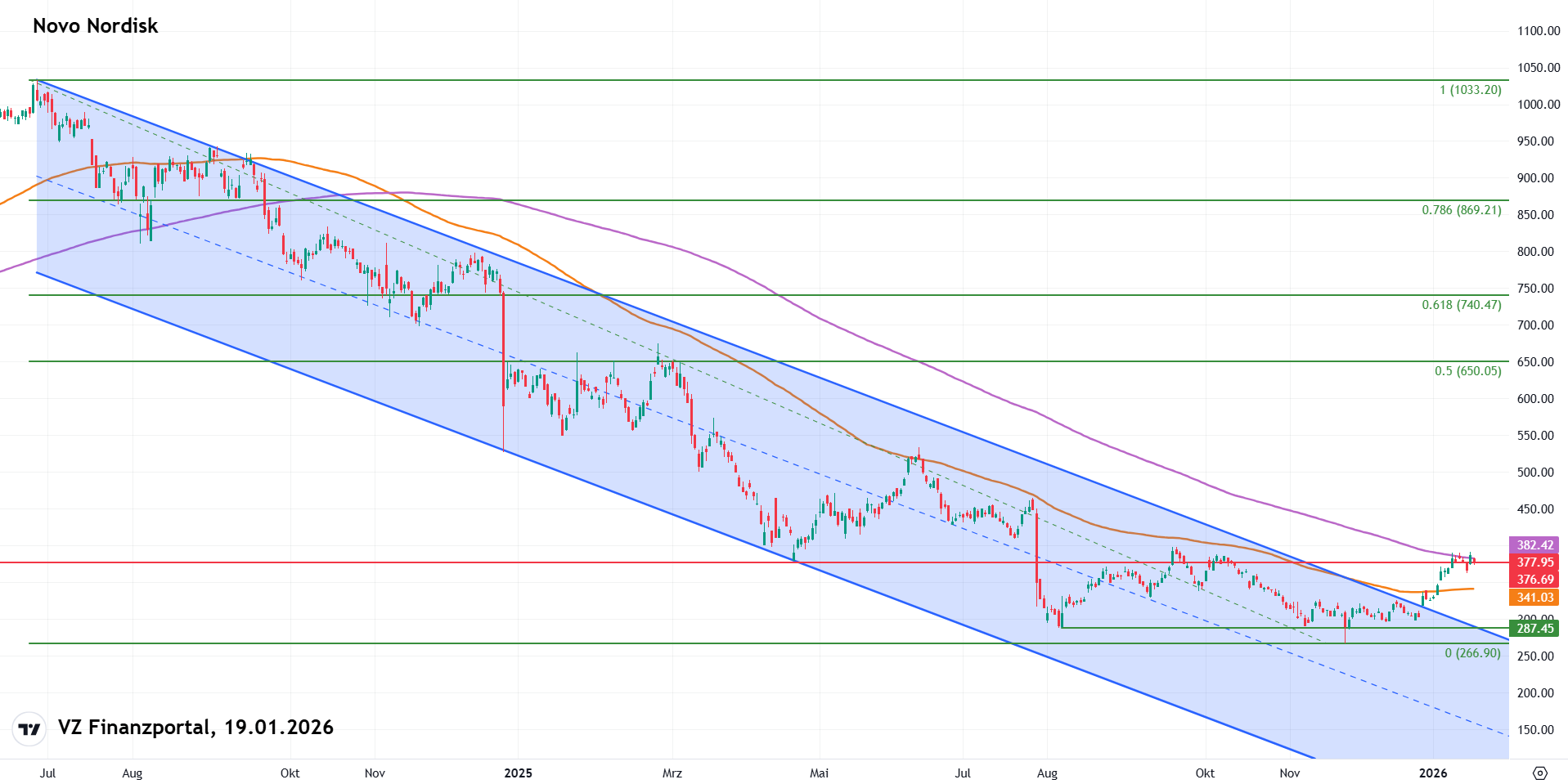 Schaffen es die Bullen aber auch noch die wichtige psychologische Marke von 400 Kronen zurückzuerobern, dann würde sich auf der Oberseite die 650-Kronen-Marke öffnen. Dort befindet sich ein Widerstand, der Ende 2024 die Bullen zur Kapitulation zwang und gleichzeitig auch das 50%-Fibonacci-Retracement-Level vom Allzeithoch. Vom aktuellen Kursniveau entspräche das einem Kurspotenzial von über 70 Prozent.