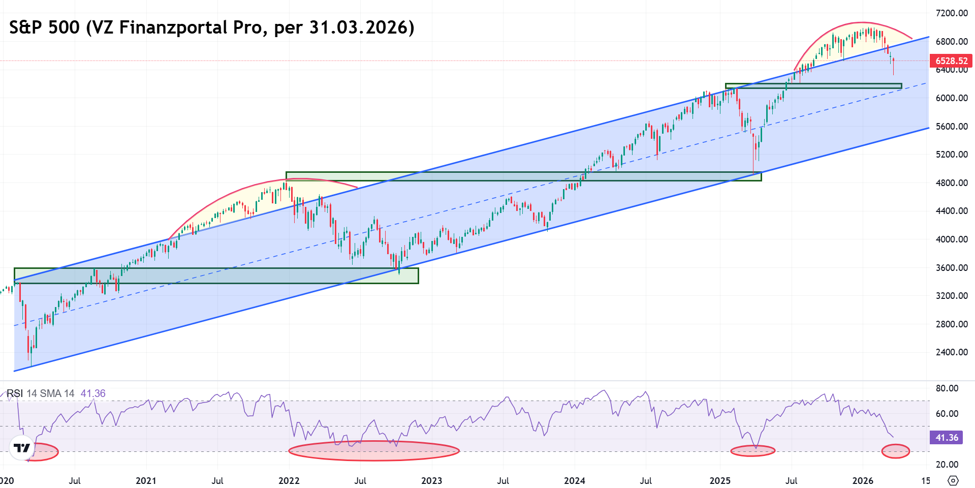 Der S&P 500 – der wichtigste Aktienindex der Welt mit den 500 grössten börsennotierten Unternehmen der USA – beeinflusst mit seiner Verfassung massgeblich das Sentiment und die Entwicklung an den anderen globalen Börsen. Seit dem Ausbruch des Iran-Kriegs hat dieser um rund 10 Prozent von seinem Allzeithoch korrigiert. Am Dienstag brachte die Hoffnung auf einen Frieden in Nahost einen starken Rebound nicht nur in den USA. Welche Gründe dafür sprechen, dass die Korrektur bald auslaufen könnte und welche nicht allzu weit entfernte Unterstützungsmarke dabei aus charttechnischer Sicht besonders im Fokus steht.
