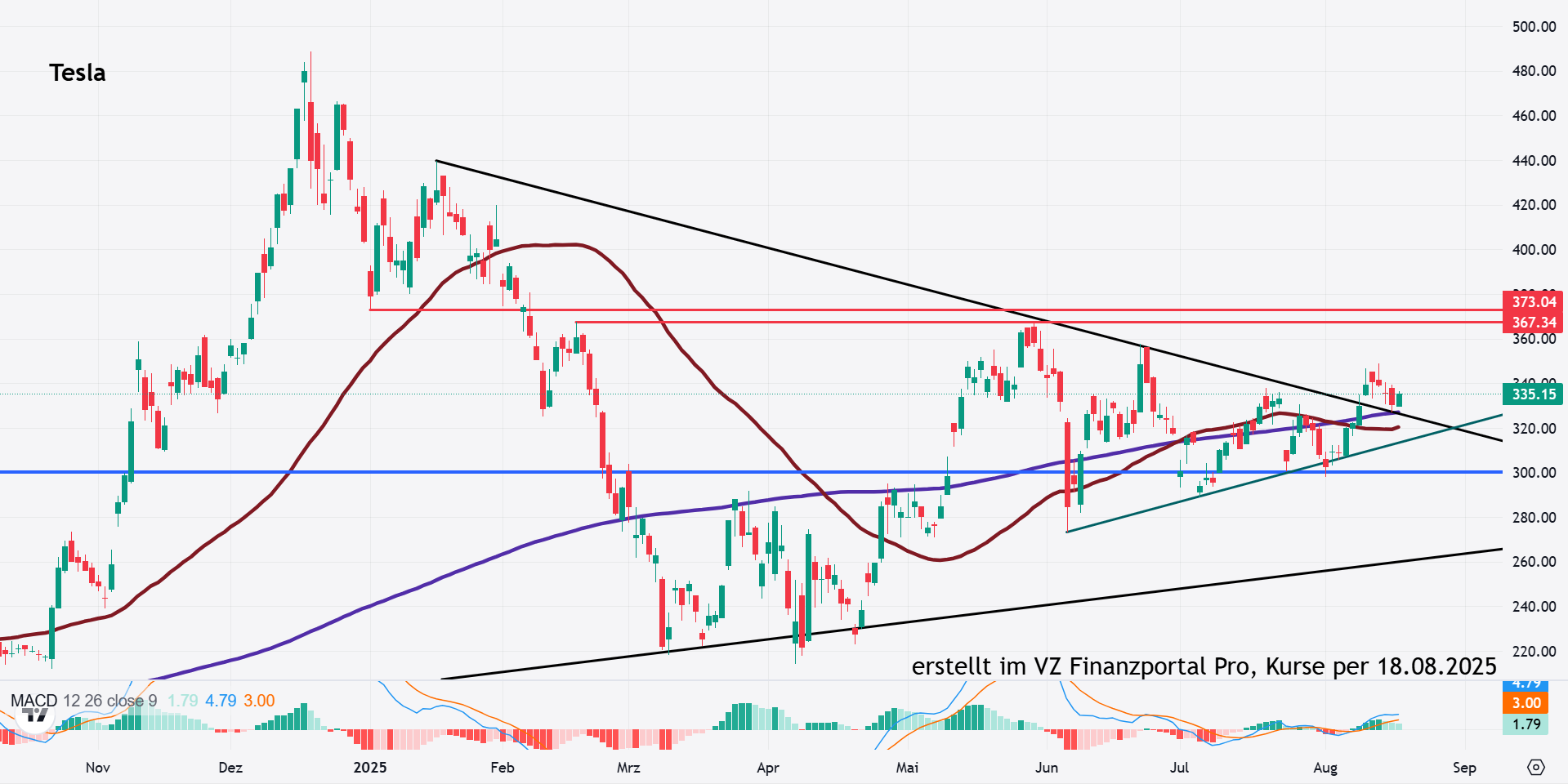 Tesla stabilisiert sich an wichtigen charttechnischen Marken – das Potenzial für den nächsten Aufwärtsschub ist intakt.