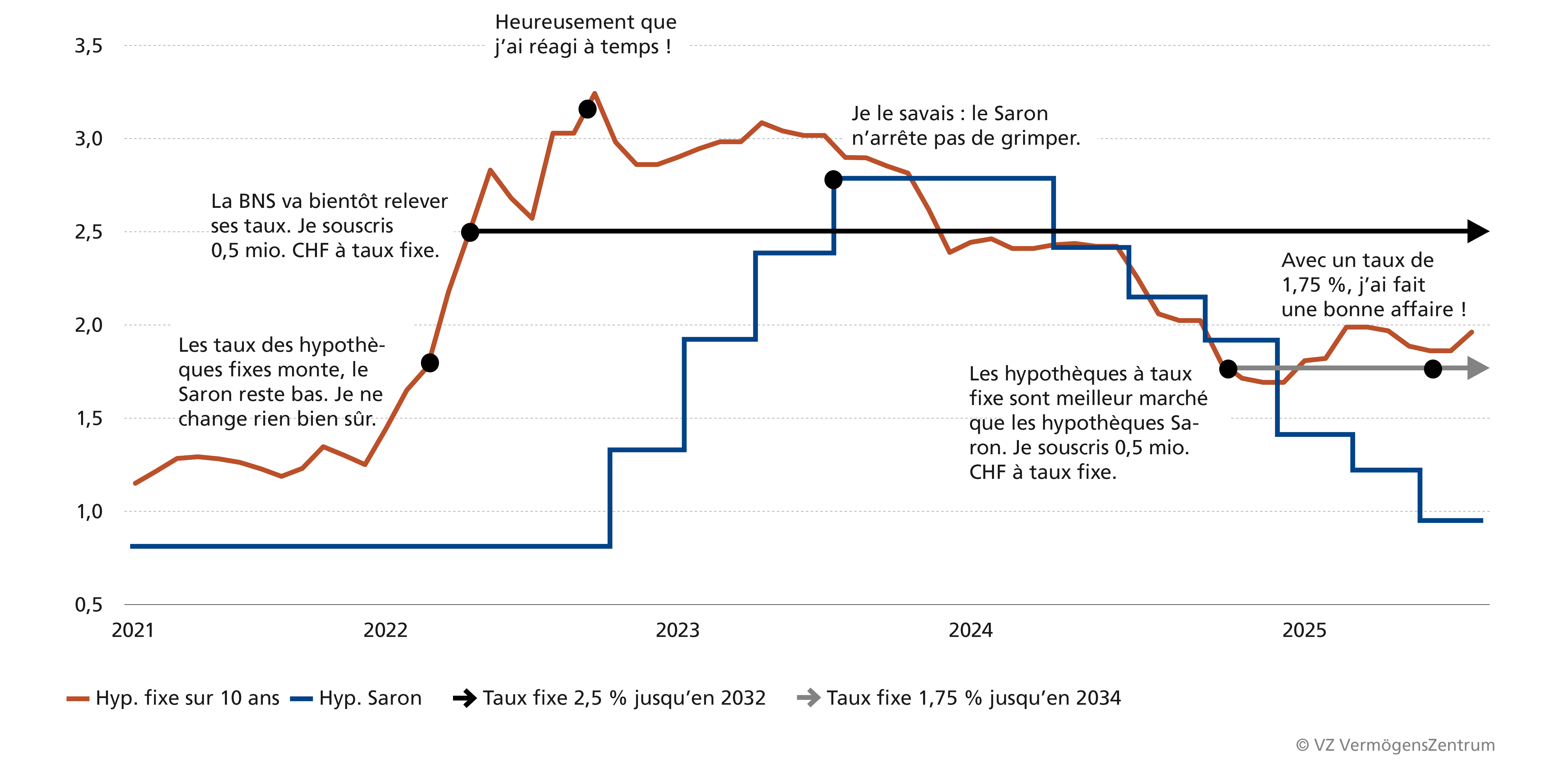 Hypothèques: de mauvaises décisions qui coûtent cherEx.: un propriétaire a envisagé en 2021 de passer d’une hypothèque Saron de 1 mio. CHF à des hypothèques fixes sur 10 ans. Il en a conclu une de 0,5 mio. CHF à 2,5 % mi-2022, et une de 0,5 mio. CHF à 1,75 % fin 2024.