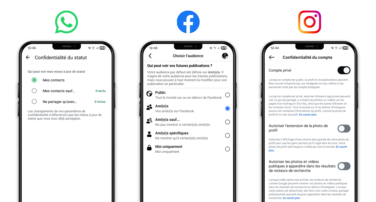 Sur Facebook, Instagram ou WhatsApp, vous pouvez définir qui peut voir vos publications. Vos profils et publications seront ainsi visibles uniquement par vos amis, par exemple. Il est également possible de contrôler qui peut entrer en contact avec vous ou vous identifier.