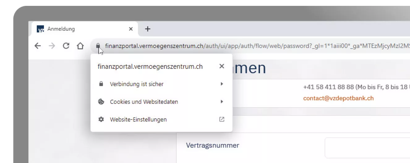Falls Sie unsicher sind, ob Sie sich auf der richtigen Login-Seite befinden, achten Sie darauf, dass eine sichere Verbindung besteht (Schloss-Symbol, richtiger Name des VZ VermögensZentrums, korrekte Internet-Adresse. Die richtige Internet-Adresse wird entweder neben dem Schloss oder nach einem Klick auf das Schloss angezeigt. Achten Sie darauf, dass die Internet-Adresse korrekt geschrieben ist. Vorsicht: Betrüger ändern oft nur einzelne Buchstaben in der Adresse ab.