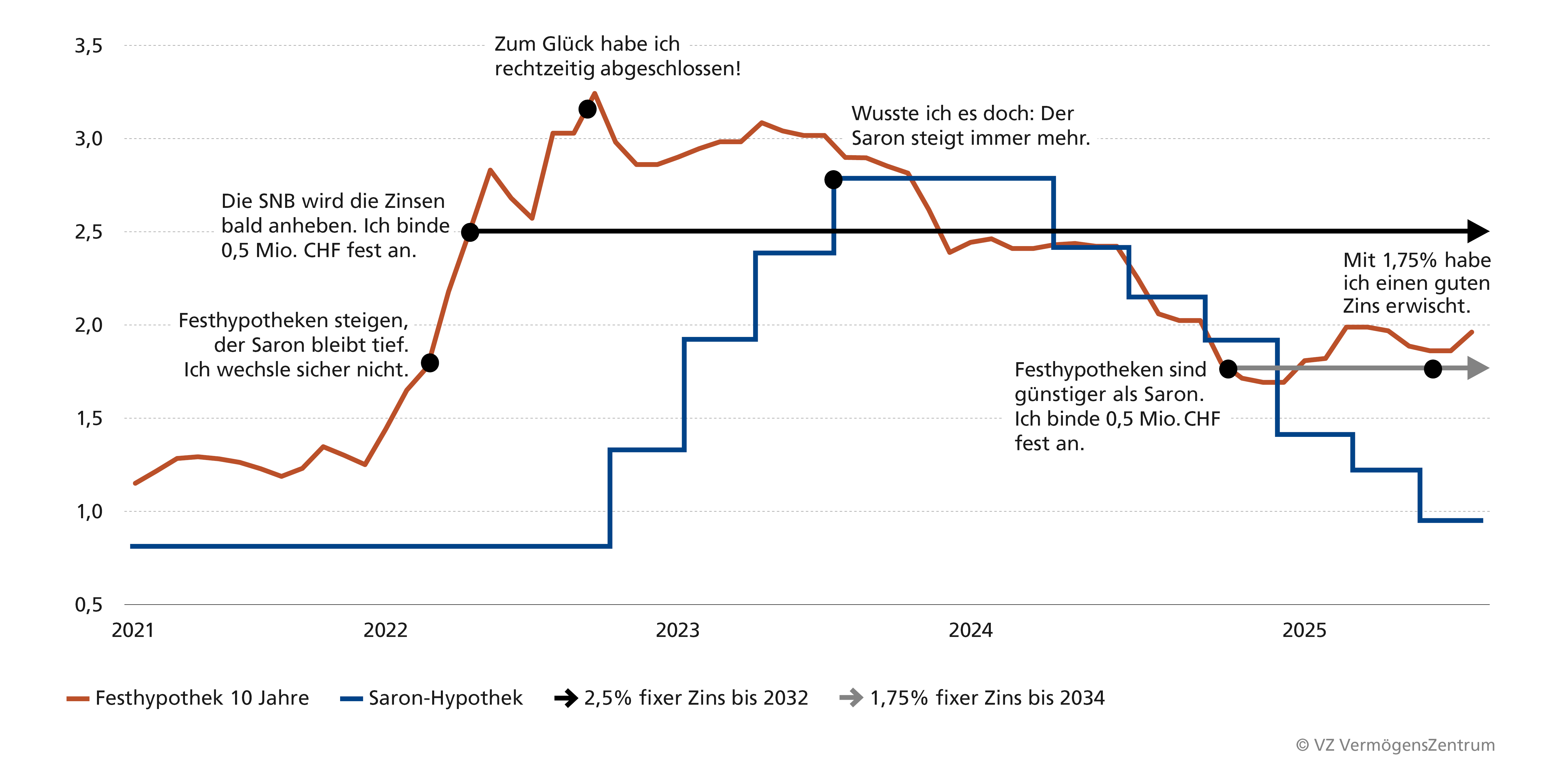Hypothek: Kostspielige FehlentscheideBeispiel: Ein Wohneigentümer überlegte sich, ab 2021 seine Saron-Hypothek über 1 Mio. CHF in 10-jährige Festhypotheken zu wechseln. Mitte 2022 schloss er 0,5 Mio. CHF zu 2,5% ab, Ende 2024 0,5 Mio. CHF zu 1,75%.