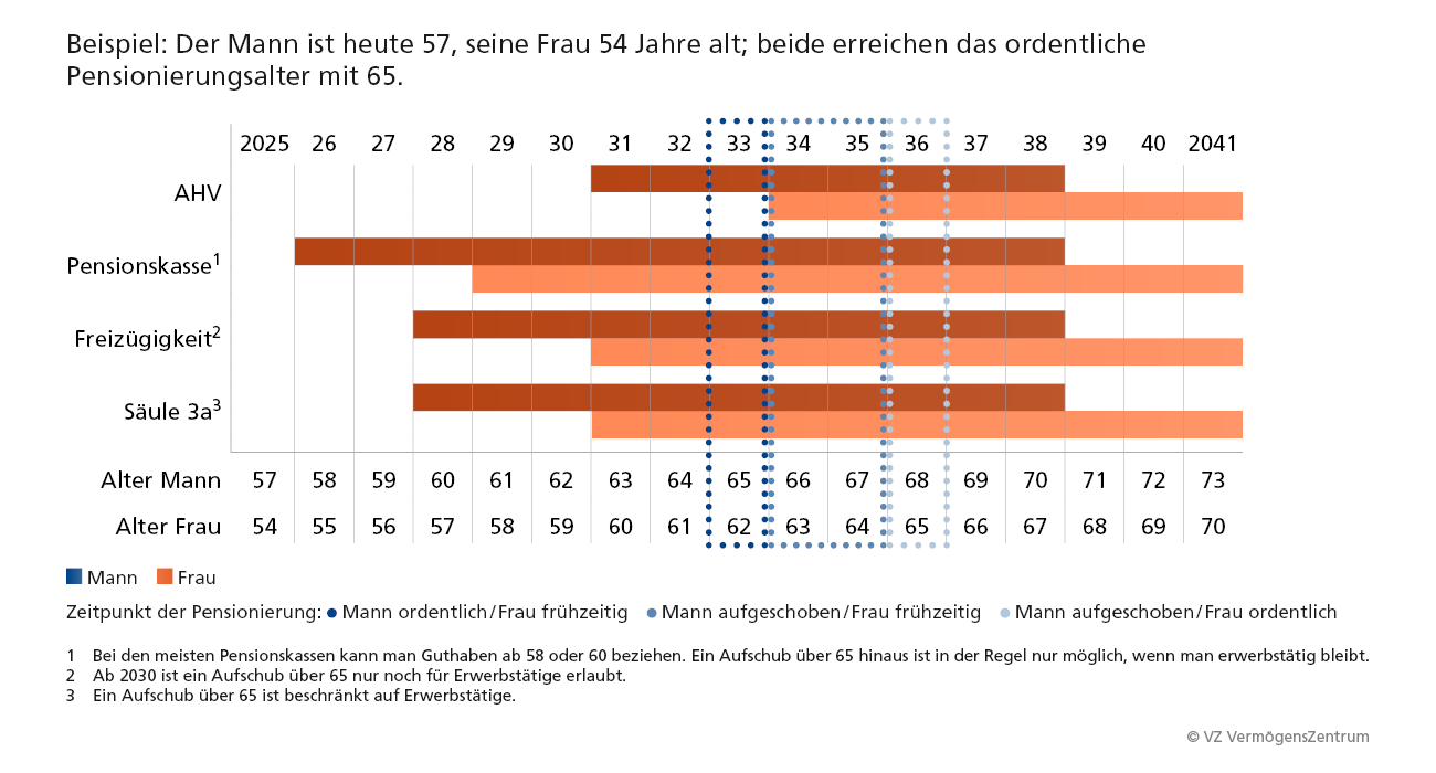 Gemeinsame Pensionierung: Welcher Ehepartner kann wann seine Vorsorge-Guthaben beziehen?